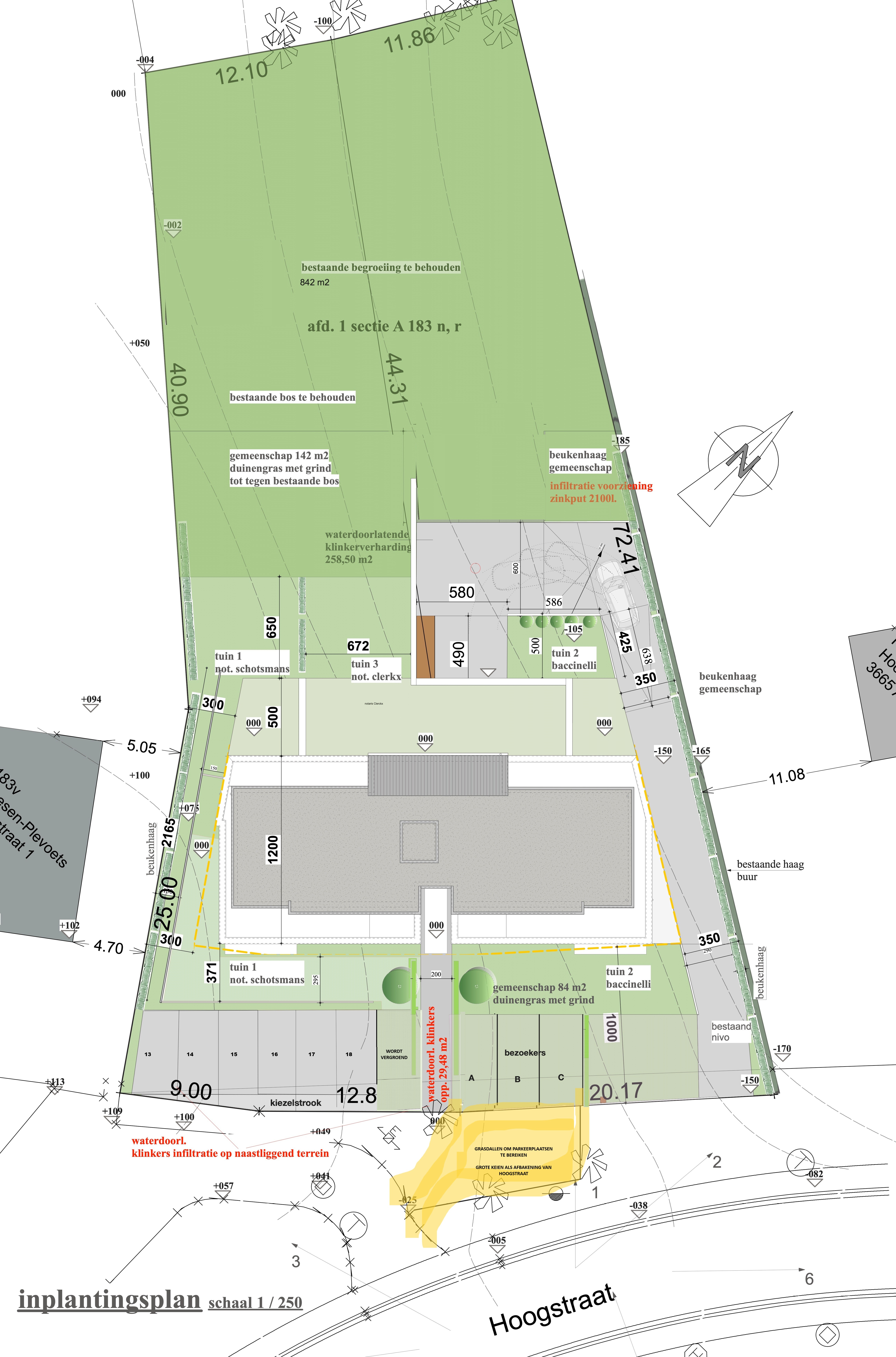 Werken - Hoogstraat 3, As: Inplantingsplan met 3 bezoekersparkings rechts